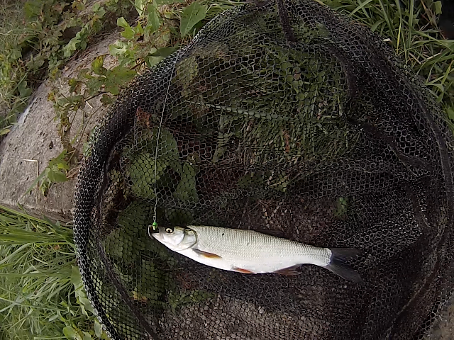 Au bout d'un instant, j'aperçois enfin mon poisson, je n'avais pas de doute, c'est bien un superbe Aspe, je m'assieds, les pieds dans l'eau avec mes cuissardes pour tendre mon épuisette, il glisse dedans, ça y est, j'ai mon Aspe !